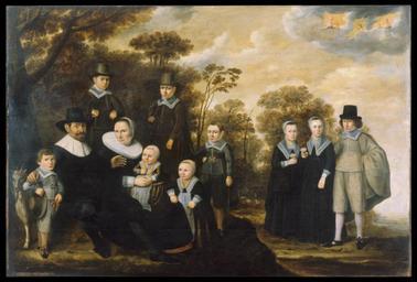 | Keywords: Dutch - Portrait of a Family - Walters 37287.jpg It was in the Dutch Republic that the family portrait first became a significant subject particularly among the middle class This is due in part to the important role of women in Dutch society as well as to the prosperity and political power of the middle class The seated parents are surrounded by their children who stand in respect The souls of infants who died young or were stillborn hover above The rural setting indicates that the family has property; however their attire is sober excepting the lustrous East-Indian pearls worn by the girls possibly to suggest the dowries they will bring to marriage In addition the two girls of marriageable age carry roses-they are in bloom The boys have one hand on the hip a gesture of determination associated in portraiture with the man on guard ready to defend the family Maybe the family members did all look alike but more likely this provincial artist was unable to register the distinctions between 1635 1640 Baroque oil on panel cm 142 8 181 2 accession number 37 287 39703 Don Marcello Massarenti Collection Rome Henry Walters city Baltimore Walters Art Museum Henry Walters Acquired by Henry Walters with the Massarenti Collection 1902 place of origin Holland Netherlands Walters Art Museum license 2D Baroque paintings in the Walters Art Museum Art of the Netherlands Media contributed by the Walters Art Museum needs category review |