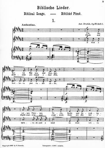 Keywords: Dvorak's Biblicke Pisne i-3.jpg Dvorak's_Biblicke_Pisne_i- jpg 2 4 Antonín Dvořák's Biblícké Písně Biblical Songs Op 99 1884 Book 1 containing Songs 1-5 While Dvorak later orchestrated the work this the complete original piano-and-voice version While the massacre of the original music to fit the German and English is appalling it does contain the original Czech and the original music for the Czech The German and English should probably be considered only as a translation This is the first five songs out of ten the other five are printed in a second volume I have not yet tracked down I haven't been able to find Book 2 unfortunately 1895 copy in my own possession The only copyright claimed on the sheet music itself is to N Simrock which is a publishing house Antonin Dvorak PD-Old Original Czech From http //music ibiblio org/pub/multimedia/pandora/vorbis/contrib/Marta_Chaloupka_Live/Czech notes accompanying the Pandora Music recording 1 Psalm 97 2-6 Oblak a mrákota jest vůkol Něho spravedlnost a soud základ trůnu Jeho Oheň předchází jej a zapaluje vůkol nepřátele Jeho Zasvěcujíť se po okršlku světa blýskání Jeho; to vidouc země děsí se Hory jako vosk rozplývají se před obličejem Hospodina panovníka vší země a slávu jeho spatřují všichni národové 2 Psalms 119 114-117 119 120 Skrýše má a pavéza má Ty jsi na slovo Tvé očekávám Odstuptež ode mne nešlechetníci abych ostříhal přikázaní Boha svého Posiluj mne bych zachován byl a patřil k ustanovením Tvým ustavičně Děsí se strachem před Tebou tělo mé; nebo soudů Tvých bojím se náramně 3 Psams 55 1 2 4/5 6 7 8 Slyš ó Bože Slyš modlitbu mou a neskrývej se před prosbou mou Pozoruj a vyslyš mne neboť naříkám v úpění svém a kormoutím se Srdce mé tesklí ve mně a strachové smrti přišli na mne a hrůza přikvačila mne I řekl jsem Ó bych měl křídla jako holubice zaletěl bych a poodpočinul Aj daleko bych se vzdálil a přebýval bych na poušti Pospíšil bych ujíti větru prudkému a vichřici 4 Psalms 23 1-4 Hospodin jest můj pastýř nebudu míti nedostatku Na pastvách zelených pase mne k vodám tichým mne přivodí Duši mou občerstvuje vodí mne po stezkách spravedlnosti pro jméno své Byť mi se dostalo jíti přes údolí stínu smrti nebuduť se báti zlého nebo Ty se mnou jsi; a prut Tvůj a hůl Tvá toť mne potěšuje 5 Psalms 144 9 145 1-3 5 6 Bože Bože píseň novou zpívati budu Tobě na loutně a žalmy tobě prozpěvovati Na každý den dobrořečiti budu Tobě a chváliti jméno Tvé na věky věků Hospodin jistě veliký jest a vší chvály hodný a velikost jeho nemůž vystižena býti O slávě a kráse a velebnosti Tvé i o věcech Tvých předivných mluviti budu A moc přehrozných skutků Tvých vsichni rozhlašovati budou; i já důstojnost Tvou budu vypravovati 6 Psalms 61 1 3 4 63 1 4/5 Slyš ó Bože volání mé pozoruj modlitby mé Nebo jsi býval útočiště mé a pevná věže před tváří nepřítele Buduť bydliti v stánku tvém na věky schráním se v skrýši křídel tvých Bože Bůh silný můj ty jsi tebeť hned v jitře hledám Tebe žízní duše má po tobě touží tělo mé v zemi žíznivé a vyprahlé v níž není vody A tak abych tobě dobrořečil a s radostným rtů prozpěvováním chválila by tě ústa má 7 Psalms 137 1-5 Při řekách Babylonských tam jsme sedávali a plakávali rozpomínajíce se na Sion Na vrbí v té zemi zavěšovali jsme citary své když se tam dotazovali nás ti kteříž nás zajali na slova písničky říkajíce Zpívejte nám některou píseň Sionskou Odpovídali jsme Kterakž bychom mohli zpívati píseň Hospodinovu v zemi cizozemců Jestliže se zapomenu na tebe ó Jeruzaléme ó zapomeniž i pravice má umění svého 8 Psalms 25 16-18 20 Popatřiž na mne a smiluj se nade mnou neboť jsem opuštěný a strápený Soužení srdce mého rozmnožují se z úzkostí mých vyveď mne z úzkostí mých vyveď mne Smiluj se nade mnou Viz trápení mé a bídu mou a odpusť všecky hříchy mé Ostříhej duše mé a vytrhni mne ať nejsem zahanben neboť v tebe doufám neboť v tebe doufám 9 Psalms 121 1-4 Pozdvihuji očí svých k horám odkud by mi přišla pomoc Pomoc má jest od Hospodina kterýž učinil nebe i zemi Nedopustíť aby se pohnouti měla noha tvá nebo nedřímeť strážný tvůj Aj nedřímeť ovšem nespí ten kterýž ostříhá Izraele 10 Psalms 98 1 4/5 7 8 96 12/11 Zpívejte Hospodinu píseň novou neboť jest divné věci učinil Zvuk vydejte prozpěvujte a žalmy zpívejte Zvuč moře i to což v něm jest okršlek světa i ti což na něm bydlí Řeky rukama plésejte spolu s nimi i hory prozpěvujte Plésej pole a vše což na něm plésej země zvuč i moře i což v něm jest Biblické písně Psalm 97 Biblické písně Music in 1894 Christianity in the Czech Republic Czech language |