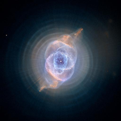 | Keywords: cat's eye nebula catseyenebula ngc 6543 ngc6543 In this detailed view from the NASA/ESA Hubble Space Telescope, the so-called Cat's Eye Nebula looks like the penetrating eye of the disembodied sorcerer Sauron from the film adaptation of "Lord of the Rings." The nebula, formally catalogued NGC 6543, is every bit as inscrutable as the J.R.R. Tolkien phantom character. Although the Cat's Eye Nebula was the first planetary nebula ever to be discovered, it is one of the most complex planetary nebulae ever seen in space. A planetary nebula forms when Sun-like stars gently eject their outer gaseous layers to form bright nebulae with amazing twisted shapes. In this detailed view from the NASA/ESA Hubble Space Telescope, the so-called Cat's Eye Nebula looks like the penetrating eye of the disembodied sorcerer Sauron from the film adaptation of "Lord of the Rings." The nebula, formally catalogued NGC 6543, is every bit as inscrutable as the J.R.R. Tolkien phantom character. Although the Cat's Eye Nebula was the first planetary nebula ever to be discovered, it is one of the most complex planetary nebulae ever seen in space. A planetary nebula forms when Sun-like stars gently eject their outer gaseous layers to form bright nebulae with amazing twisted shapes. |