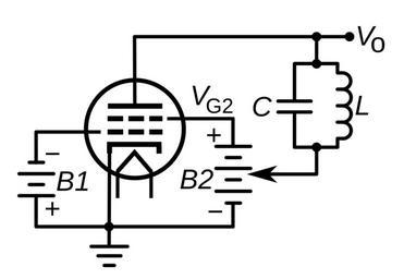 | Keywords: Dynatron oscillator circuit.svg dynatron oscillator a type of vacuum tube electronic oscillator which uses negative resistance caused by secondary emission of electrons from the anode of a tetrode tube The screen grid is biased at a higher voltage than the anode causing secondary electrons knocked out of the plate by electrons from the cathode to flow to the screen Therefore the anode current decreases with an increase in cathode-to-anode voltage The negative differential resistance of the tube cancels the inherent positive resistance of the tuned circuit LC connected across the anode creating in effect a tuned circuit with zero AC resistance Spontaneous oscillations arise at the tuned circuit's resonant frequency <math>\scriptstyle f\; \; 2\pi/\sqrt LC </math> started by noise in the circuit when it is turned on Invented in 1918 by Albert Hull and used from the 1920s to the 1940s the dynatron oscillator is now obsolete 2015-03-19 own Chetvorno other versions cc-zero Uploaded with UploadWizard Oscillator circuits |