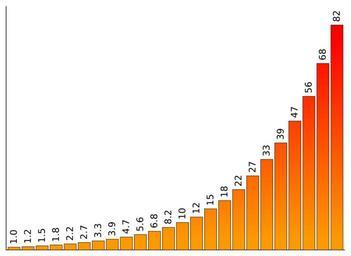| Keywords: E12 values graph.svg en Graph showing values of the E12 series which is used to standardize values of resistors and capacitors The values shown cover two decades of the series from 1 to 82 and illustrate the exponential nature of the series Own work by uploader designed to replace original bitmap image Image E12_values_graph png Qef 2008-07-03 Bitmap version showing the same data but with superfluous labels making it not language neutral Image E12_values_graph png Qef Source code This graph was generated by the Perl program below which was specially written for the purpose If changes need to be made it's probably best to tweak the program and re-run it to get a new version rather than editing the SVG directly <pre> use warnings; use strict; The E12 series twice over the first time divided by 10 my VALUES qw 1 0 1 2 1 5 1 8 2 2 2 7 3 3 3 9 4 7 5 6 6 8 8 2 10 12 15 18 22 27 33 39 47 56 68 82 ; Parameters to set appearance my AXIS_HT 400; my VERT_SCALE 4 5; my BAR_WIDTH 20; my BAR_GAP 3; my MARGIN 10; my img_wd BAR_WIDTH + BAR_GAP VALUES + BAR_GAP + 2 MARGIN; my img_ht AXIS_HT + 2 MARGIN; my margin_right img_wd - MARGIN; my margin_bottom img_ht - MARGIN; my x MARGIN; my graph_path ; my text_cmds ; for VALUES x + BAR_GAP; my bar_ht _ VERT_SCALE; graph_path M x margin_bottom v- bar_ht h BAR_WIDTH v bar_ht Z\n ; x + BAR_WIDTH; my bar_top img_ht - bar_ht - MARGIN + -5; my txt_x x - 0 5 BAR_WIDTH + 4 5; text_cmds <text transform 'translate txt_x bar_top rotate 270 ' x '0' y '0' fill ' 000' text-anchor 'start'> _</text>\n ; print << END ; < xml version 1 0 encoding UTF-8 > <svg version 1 0 width img_wd height img_ht xmlns http //www w3 org/2000/svg > <defs> <linearGradient id grad x2 0 y1 0 y2 100 > <stop offset 5 stop-color F00 /> <stop offset 95 stop-color F90 /> </linearGradient> </defs> <path stroke 000 stroke-width 1 fill none d M MARGIN MARGIN V margin_bottom H margin_right /> <path stroke 000 stroke-width 0 6 fill url grad d graph_path /> <path stroke 333 stroke-width 0 6 fill url grad d graph_path > </g> </svg> END </pre> E12 values |