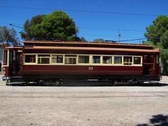 | Keywords: E1 111 side profile, March 2009.jpg en Side profile shot of E1 111 as preserved at the St Kilda Tramway Museum The side to the left shows the original saloon while the side to the right of the centre of the tram shows the converted end easily noticable by the smaller size windows March 2009 own William Adams 2009-03-08 Adelaide tramway museum |