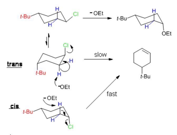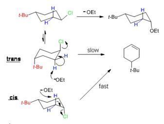 | Keywords: E2 14tBuchexCl.png en Bimolecular elimination E2 reaction mechanism operating on cyclohexane conformers el Διμοριακη β-α όσ αση Ε2 μηχανισμός και η αφυδραλογόνωση α ο trans διαξονικές θέσεις του κυκλοεξανικού ανάκλιντρου my own Cleanthis 2010-08-15 ImageNote 1 200 231 8 8 476 392 2 The trans isomer can not eliminate via the axial conformer which although in the correct geometry it is energetically very unfavored because of the axial t-Butyl group <br>The cis isomer has the correct geometry already in the most stable conformer with t-Butyl equatorial and it does eliminate ImageNoteEnd 1 ImageNote 2 234 182 8 8 447 340 2 The cis isomer eliminates fast as the predominant conformer posesses the required geometry <br>The trans isomer shows correct geometry only in the unfavored conformer and elimination is slow loosing out to the competing substitution reaction ImageNoteEnd 2 Stereochemistry Reaction mechanisms |