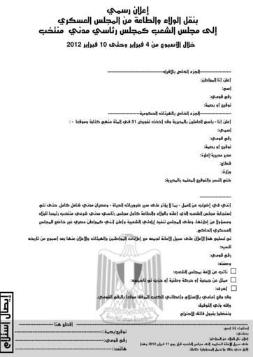 Keywords: E3lan11feb2012.jpg ar إعلان رسمي بنقل الولاء والطاعة من المجلس العسكري لمجلس الشعب المصري كمجلس رئاسي منتخب خلال الأسبوع من 4 فبراير وحتى 10 فبراير 2012 2012-02-04 own Opensourceit السلام عليكم جميعا أيها الأساتذة والزملاء الأفاضل، كما ترون، فقد سرت الدعوة للإضراب والعصيان المدني في مصر منذ أيام أرجو قراءة الاقتراح المرفق فورا، ودراسته سريعا اليوم، واتخاذ القرار بشأنه في أسرع وقت، إن رأيتم جدواه شكرا جزيلا لينجح الإضراب أعلن تسليم ولائك لمجلس الشعب كمدلس رئاسي مدني حتى يكون الإضراب/العصيان المدني الشعبي في مصر لتسليم السلطة حلا كاملا للأزمة لابد معه من إعلان تسليم ولاء لسلطة مدنية بديلة إعلان ولاء من كل وزارة أو قطاعات وراء قطاعات داخل جميع الوزارات بمديرياتها بما فيها وزارة الدفاع والداخلية وجميع مرافق البلاد بهذا تكون البلد كلها سلمت السلطة لجهة مدنية منتخبة شرعية بديلة وهي مجلس الشعب باعتباره المجلس الرئاسي المدني الشرعي المنتخب وعدم طاعة أي أوامر تصدر من المجلس العسكري إلا بعد مصادقتها من مجلس الشعب باعتباره المجس الرئاسي المدني الشرعي الوحيد هذا نموذج إعلان ولاء توقيع للهيئات الحكومية والوزارات بمكان لختم النسر ومكان إمضاء مدير المديرية، ومعه في نفس الورقة نموذج لأفراد المواطنين برقم البطاقة والهاتف والتوقيع أو البصمة لكل مواطن، ويتم تسليمها إلى أعضاء مجلس الشعب - أو لفروع الجمعية الوطنية للتغيير أو حركة 6 أبريل أو غيرها من الحركات والمنظمات الوطنية الموثوق في أمانتها والتي قادت الدعوة لهذه الثورة، وفروعها في المحافظات على سبيل الأمانة ويظل كعب التسليم مع المواطن أو رئيس الهيئة، وذلك من اليوم وحتى 10 فبراير حين يقوم مجلس الشعب بحصر الاستمارات - بعد أن تكون كل جهة شعبية حصرت الوارد إليها على حدة - وإعلان استلام السلطة من الشعب في يوم 11 فبراير ابدأ الان فأمام مصر ستة أيام فقط للانتهاء من تجميع الإعلان الشعبي الكامل لنقل السلطة دورك كفرد طبع ونشر وتوزيع الإعلان بكل حماس لكل الناس حولك بالايميل والمحمول والبلوتوث وفي الصحف والشارع دورك كنائب برلمان أو حركة أو حزب أو منظمة إصدار بيان فوري الآن بتبني الإعلان وتحمل مسؤولية توزيع واستلام وجمع الإعلانات من المواطنين، لتسليمها لمجلس الشعب الشرعي يوم 10 فبراير نص الإعلان ____________________________ إعلان رسمي بنقل الولاء والطاعة من المجلس العسكري لمجلس الشعب كمجلس رئاسي منتخب خلال الأسبوع من 4 فبراير وحتى 10 فبراير 2012 ----------------------الجزء الخاص بالأفراد--------------------------------------- أعلن أنا المواطن اسم رقم قومي توقيع أو بصمة ----------------------الجزء الخاص بالهيئات الحكومية---------------------- أعلن أنا - باسم العاملين بالمديرية وقد أخذت تفويض 51 في المئة منهم كتابة وموقعا - اسمي رقم قومي توقيع أو بصمة مدير مديرية/إدارة قطاع وزارة ختم النسر والتوقيع المعتمد بالمديرية ---------------------- أنني في إضراب عن العمل - بما لا يؤثر على سير ضروريات الحياة بمصر - وعصيان مدني شامل كامل، حتى تتم استجابة مجلس الشعب الذي أعلنه بالولاء والطاعة كأول مجلس رئاسي مدني شرعي منتخب رئيسا للبلاد ومسؤولا عن إدارتها، واستجابة كافة الوزارات بما فيها وزارة الدفاع والقوات المسلحة وعلى المجلس تنفيذ إرادتي الشعبية وأعلن أنني كمواطن مصري غير خاضع للمجلس العسكري الحاكم تم تسليم هذا الإعلان - على سبيل الأمانة لجمعه مع إعلانات المواطنين والهيئات والإعلان عنها بعد أسبوع من تاريخه - للسيد رقم قومي وصفته نائب عن الأمة بمجلس الشعب ممثل عن جمعية أو حركة وطنية أو حزب تم تاسيسه أخرى اذكرها وقد وقع أمامي بالاستلام وأعطاني الكعب المرفق موقعا برقمه القومي وهاتفه والله ولي التوفيق وتفضلوا بقبول فائق الاحترام إيصال استلام استلمت أنا اسم بصفتي إعلان نقل الولاء من المواطن على سبيل الأمانة لتسليمه إلى مجلس الشعب قبل يوم 11 فبراير 2012 وهذا إقرار مني بذلك وأتحمل المسؤولية كاملة توقيع/بصمة ------------------------------------------
