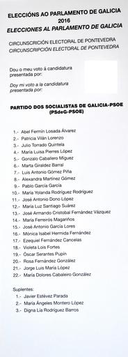 Keywords: E. ao Parlamento de Galicia 2016. C. E. de Pontevedra. PSdeG-PSOE.jpg gl Eleccións ao Parlamento de Galicia 2016 Circunscrición Electoral de Pontevedra 2016-09-25 13 59 07 own HombreDHojalata other versions cc-zero PD-SpanishGov es se borro el logotipo del partido político por copyright borrouse o logotipo do partido político por copyright Ballot papers for the 2016 Galician parliamentary election for the province of Pontevedra All medias supported by Wikimedia España in 2016 Ballot papers for Partido Socialista Obrero Español Abel Losada