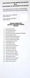 | Keywords: E. ao Parlamento de Galicia 2016. C. E. de Pontevedra. PACMA.jpg gl Eleccións ao Parlamento de Galicia 2016 Circunscrición Electoral de Pontevedra 2016-09-25 13 58 44 own HombreDHojalata other versions cc-zero PD-SpanishGov es se borro el logotipo del partido político por copyright borrouse o logotipo do partido político por copyright Ballot papers for the 2016 Galician parliamentary election for the province of Pontevedra All medias supported by Wikimedia España in 2016 Ballot papers for Partido Animalista Contra el Maltrato Animal |