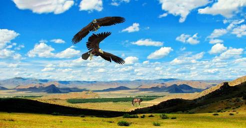 Keywords: eagles bird birds horses prairie steppe mountains serra blue sky clouds nature