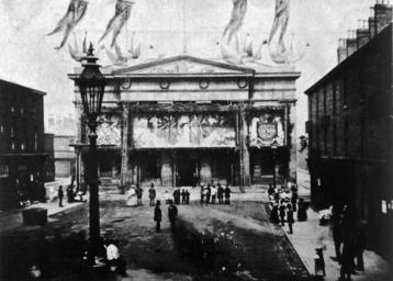 | Keywords: Earliest known photograph of salford.jpg en The Crimean War Pear Celebrations A painting hangs from the front portico of the Town Hall lit by gas burners In the centre PEACE holds an olive branch and globe to the left a lion and lamb represent tranquillity figures of AGRICULTURE stand with vegetables MUSIC LYRES and POETRY are also used A seaport shows the prosperity from peace On the right of PEACE a snapped sword the crown of victory JUSTICE holds a balance UNITY a bundle of rods A veil hides the figure of War from Peace The arms of Salford and the Duchy of Lancaster are represented along with the Royal coat of arms Above the building fly the flags of France Turkey Sardinia and Russia with Britain in the middle Salford A City and its Past Bergin Pearce Shaw photographer unknown 1856-05 Photographer unknown but as the image was taken in 1856 its extremely unlikely s he lived 70 years ago PD-old Salford Greater Manchester |