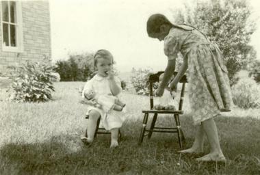 | Keywords: mennonite community children mennonitecommunitychildren new holland newholland pennsylvania earline zimmerman earlinezimmerman erma zimmerman ermazimmerman dolls chairs monochrome Caption: July 21, 1949. New Holland, Pennsylvania. Earline Zimmerman, 9. Erma Zimmerman, 2, sitting on chairs which are copies of old fashioned chairs. Citation: Mennonite Community Photograph Collection, 1947-1953. Children Groups. HM4-134 Box 2 Photo 260-2. Mennonite Church USA Archives - Goshen. Goshen, Indiana. Caption: July 21, 1949. New Holland, Pennsylvania. Earline Zimmerman, 9. Erma Zimmerman, 2, sitting on chairs which are copies of old fashioned chairs. Citation: Mennonite Community Photograph Collection, 1947-1953. Children Groups. HM4-134 Box 2 Photo 260-2. Mennonite Church USA Archives - Goshen. Goshen, Indiana. |