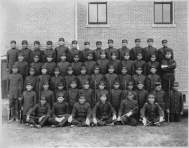 | Keywords: Early class of young men in uniform at the Albuquerque Indian School. - NARA - 292870.tif Scope and content This is one of a small collection of photographs of the Albuquerque Indian School which was established in 1881 to provide off-reservation industrial training to the Indians of the Southwest By 1912 the school had 8 primary grades and over 300 students; by 1925 enrollment increased to over 800 students and grades 11 and 12 were added The Albuquerque Indian School contined operating until 1982 when its program was transferred to the Santa Fe Indian School General notes 292870 Local identifier Department of the Interior Bureau of Indian Affairs Albuquerque Indian School 1947 - ca 1964 NARA's Rocky Mountain Region Denver NRGA Building 48 Denver Federal Center West 6th Avenue and Kipling Street Denver CO 80225-0307 other date ~ 1900 Record group Record Group 75 Records of the Bureau of Indian Affairs 1793 - 1999 Record group ARC 404 General Correspondence File of the Albuquerque Indian School compiled 1881 - 1936 Series ARC 292863 File unit File unit ARC Variant control numbers NAIL Control Number NRG-75-AISP-7 yes Other versions NARA-cooperation PD-USGov Albuquerque Indian School New Mexico in the 1880s Portraits of boys |