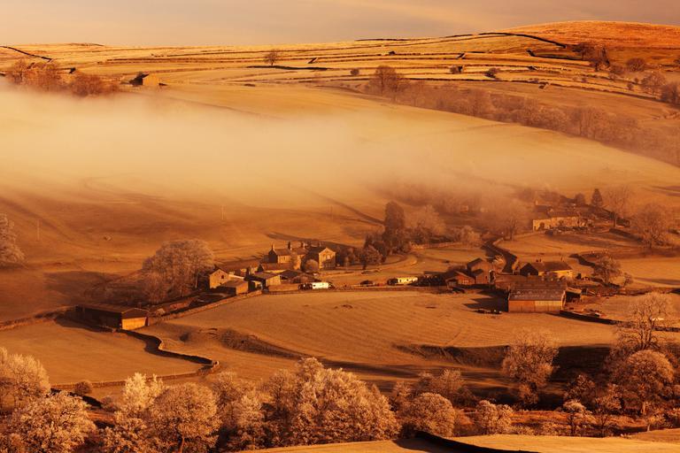 Keywords: cloud dawn early fog foggy hill hills land landscape light mist misty morning nature rural sunrise valley weather orange farm