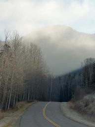 Keywords: early morning sunrise clouds canim lake british columbia canada scenery weather beautiful nature mood outdoor morning glory countryside landscape fog first frost autumn fog bank paved road