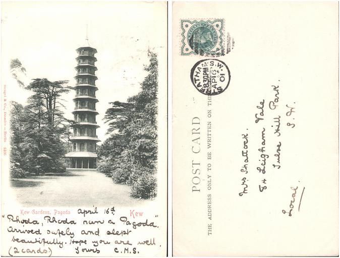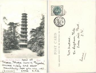 | Keywords: public domain publicdomain text drawing sketch I believe that this is the earliest real photo postcard of Kew Gardens that I own. Postmarked Streatham, 16 April 1901. Sent by "C.M.S" to a Mrs Shattock, 84 Leigham Vale, Tulse Hill Park, London. This would appear to be the house on Google Street View - maps.google.co.uk/maps?q=84+Leigham+Vale,+Lambeth&hl=... and see comment below for more details about Alice Shattock, and the possibility that 'C.M.S' is her daughter Constance M. I believe that this is the earliest real photo postcard of Kew Gardens that I own. Postmarked Streatham, 16 April 1901. Sent by "C.M.S" to a Mrs Shattock, 84 Leigham Vale, Tulse Hill Park, London. This would appear to be the house on Google Street View - maps.google.co.uk/maps?q=84+Leigham+Vale,+Lambeth&hl=... and see comment below for more details about Alice Shattock, and the possibility that 'C.M.S' is her daughter Constance M. |
