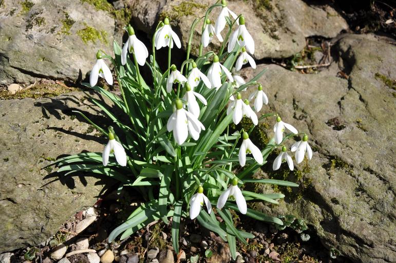 Keywords: early spring snow spring flowers end of winter zwiebelpflanze white erstblüte bell common snowdrop nature spring snowdrop stones garden close flower flowers