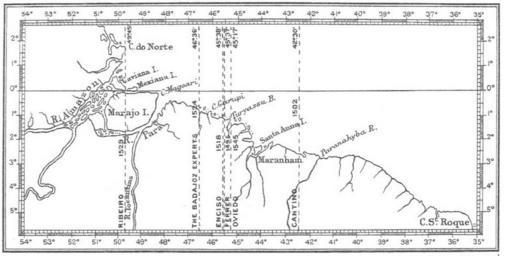 | Keywords: Early Tordesillas lines.jpg Early demarcation lines 1495 “1545 for the Treaty of Tordesillas 1494 http //books google com/books id 9d9EAAAAIAAJ printsec frontcover The Diplomatic History of America Its first chapter 1452 ”1493 ”1494 frontispiece 1897 Henry Harrisse c 1830 “1910 PD-old Treaty of Tordesillas 1494 |