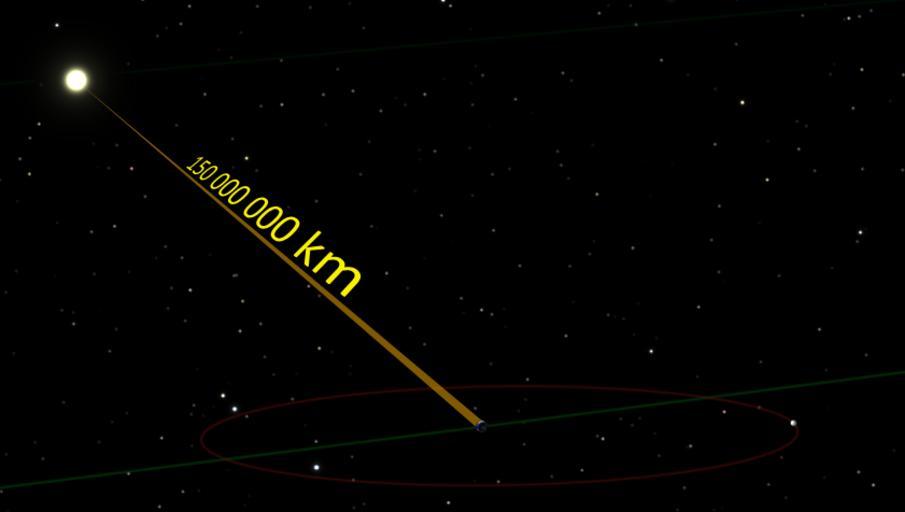 Keywords: Earth to Sun.png en Illustration of Earth's distance to the Sun with orbits highlighted Earth's orbit is in green and Moon's orbit is in red Created using Celestia and some further manual editing The moon is roughly a pixel larger than it should be own LucasVB With labels in English Astronomical diagrams |
