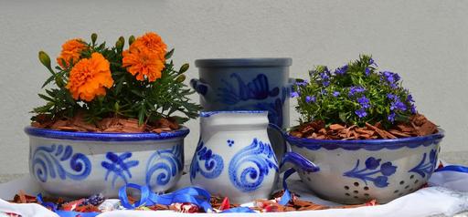 Keywords: earthenware ceramic grey blue flowers clay pot arrangement decorative garden