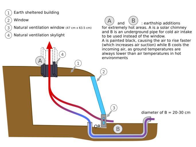 Keywords: Earthship-ventilation-cooling-tube-schematic.svg en A picture of the workings of natural ventilation in a earthship earthship design for arid subtropical climate; uses windows tilted at 60° Schematic was based on a picture found in the book Earthship Vol 2 Systems and Components by Michael Reynolds EarthshipVentilation_new png 2013-04-27 23 30 UTC derivative work Anasofiapaixao EarthshipVentilation_new png Tirkfl EarthshipVentilation_new png Vectored slight rewording of the image text different look for the airflux arrow Anasofiapaixao EarthshipVentilation_new png Anasofiapaixao Anasofiapaixao exp h Sustainable architecture Earthship Natural indoor ventilation |