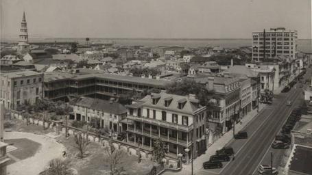 | Keywords: East Broad Street and Cooper River, Charleston).png en Typewritten note on back of photo No 1 VIEW OF CHARLESTON S C Looking east Showing East Broad St with corner of Washington Square next home of Mr Daniel Ravenel Jr 68 Broad St Confederate home Chamber of Commerce corner Broad Church with Palmetto in front N E Corner Citizens and Southern Bank of South Carolina Tall building Peoples Building Church St Philips On Cooper River by water tank U S Custom House Photo taken from St Michael's Steeple 1940 University of South Carolina South Caroliniana Library Photographs WPA-PL-CH-AV 1-7 http //digital tcl sc edu/cdm/singleitem/collection/wpaplp/id/352/rec/263 Jacobs Howard R Federal Writers' Project other versions PD-USGov Uploaded with UploadWizard History of Charleston South Carolina Aerial photographs of Charleston South Carolina |