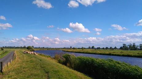 Keywords: east frisia wide dike landscape clouds river summer sheep