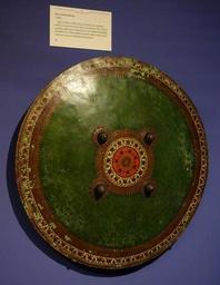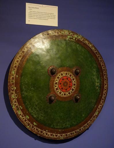 | Keywords: East Indian shield, c. 1800, rhinoceros hide - Glenbow Museum - DSC00766.JPG en Exhibit in the Glenbow Museum 130 9th Ave S E Calgary Alberta Canada This work is old enough so that it is in the public domain Photography was permitted in the museum without restriction 2013-09-21 12 11 12 own Daderot cc-zero Shields in the Glenbow Museum Uploaded with UploadWizard Rhinoceros hide Shields of the Mughal Empire | ||||