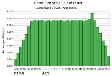 | Keywords: Easter Distribution.svg en Bar chart of the distribution of Easter Dates for the complete 5 700 000 Gregorian years 19 April is the date on which Easter falls most frequently in about 3 87 of the years 22 March is the least frequent with 0 48 (computus) 2016-03-18 own Edasubert other versions cc-zero Computus Easter |