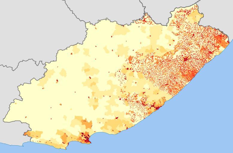 Keywords: Eastern Cape 2011 population density map.svg ffffcc <1 inhabitant/km² ffeda0 1 “3 inhabitants/km² fed976 3 “10 inhabitants/km² feb24c 10 “30 inhabitants/km² fd8d3c 30 “100 inhabitants/km² fc4e2a 100 “300 inhabitants/km² e31a1c 300 “1000 inhabitants/km² bc0026 1000 “3000 inhabitants/km² 800026 >3000 inhabitants/km² Projection is Albers Equal-Area Conic with standard parallels at 25 5° S and 31 5° S and origin at 28 5° S 25 5° E Statistics South Africa's Census 2011 is the source of the basic population data The map results from my own processing of the data Htonl 2013-10-22 http //beta2 statssa gov za/ page_id 425 The following license applies to the population data on which the map is based the user acknowledges Stats SA as the source of the basic data wherever they process apply utilise publish or distribute the data and also that they specify that the relevant application and analysis where applicable result from their own processing of the data The following tag applies to the map itself Demographic maps of South Africa Maps of the Eastern Cape |