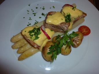 Keywords: eat asparagus small potatoes tenderloin food asparagus time meal white asparagus favorite dish restaurant court gastronomy delicious main course
