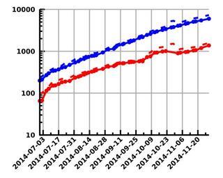 | Keywords: Ebola sierraleone2014 log.svg de Logscale-Version von File Ebola sierraleone2014 svg 2014-10-18 11 50 20 own StefanPohl other versions cc-zero v fl gnuplot 5 1 CVS reset set terminal svg size 600 480 fname 'Verdana sans-serif bold' fsize 18 lw 5 unset key set grid lt 1 lc rgb 0xAAAAAA lw 5 set border 3 lw 75 set tics nomirror set xdata time set timefmt ' Y- m- d' set format x ' Y- m- d' set autoscale fix set xtics 60 60 24 14 nomirror rotate by 45 right set for i 1 4 style line i ps 75 pt 7 set style line 1 lc rgb 0x0000FF dt 2 set style line 2 lc rgb 0x0000FF set style line 3 lc rgb 0xFF0000 dt 2 set style line 4 lc rgb 0xFF0000 NA ' ' do fordata in 'ebola_guinea2014 ebola_liberia2014 ebola_sierraleone2014' set output data ' svg' set yrange 0 plot data ' txt' \ u 1 strcol 2 eq NA strcol 3 eq NA strcol 4 eq NA 8 2+ 3+ 4 ls 1 w lines \ u 1 2 ls 2 w linespoints \ u 1 strcol 5 eq NA strcol 6 eq NA strcol 7 eq NA 9 5+ 6+ 7 ls 3 w lines \ u 1 5 ls 4 w linespoints set output data '_log svg' unset yrange set logscale y replot unset logscale y Uploaded with UploadWizard 2014 Ebola outbreak statistics |