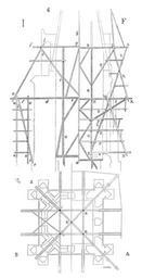 | Keywords: Echafaud.suspendu.png Habituellement les tours des grandes églises sont dans leur partie supérieure à la hauteur des beffrois sous les flèches percées sur chaque face de doubles baies étroites et longues Les angles sont renforcés de contre-forts terminés par des pinacles; mais dans les angles rentrants formés par ces contre-forts et suivant les diagonales du carré sur lequel le plan de ces tours est tracé on remarque presque toujours à la base des beffrois des trous plus ou moins grands et quelquefois des repos Au-dessus de la partie verticale des tours à la base des flèches qui s'élèvent sur plan octogonal on voit sur les huit faces des lucarnes des issues plus ou moins larges mais étroites et longues Ces dispositions nous conduisent à admettre que les échafauds destinés à élever les parties supérieures et dégagées des tours d'églises étaient suspendus c'est-à-dire qu'ils laissaient la partie inférieure des façades complétement libre Partant de ce principe soit A 6 le plan d'une tour de façade d'une grande église à la base du beffroi et B le plan de cette tour à la base de la flèche en pierre qui la couronne Wooden scaffolding |
