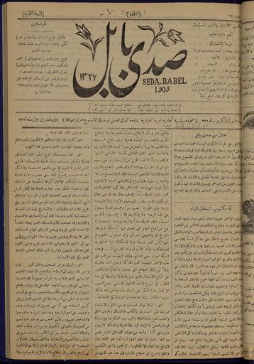 | Keywords: Echo of Babylon, Number 62, October 21, 1910 WDL12040.jpg Artwork ru Ганима Юсуф Ризк Аллаx 1885 1950 гг fr Ghanīmah Yūsuf Rizq Allāh 1885-1950 en Ghanīmah Yūsuf Rizq Allāh 1885-1950 zh 尤瑟夫·里兹克·阿拉·盖尼麦,1885-1950 年 pt Ghanīmah Yūsuf Rizq Allāh 1885 a 1950 ar غنيمة، يوسف رزق الله، 1885-1950 es Ghanīmah Yūsuf Rizq Allāh 1885-1950 ru Эхо Вавилона 62 21 октяб я 1910 года fr Écho de Babylone n° 62 21 octobre 1910 en Echo of Babylon Number 62 October 21 1910 zh 巴比伦回声报 ,第 62 ,1910 年 10 21 日 pt Eco da Babilônia Número 62 21 de outubro de 1910 ar صدى بابل، العدد الثاني والستون، 21 أكتوبر 1910 ru <em> </em><em></em><em>Seda Babel</em> Эхо Вавилона была одной из пе вых и акских газет Она издавалась в Багдаде с 1909 года и выходила еженедельно по пятницам Вплоть до окончания Пе вой ми овой войны И ак был частью Османской импе ии и на его те ито ии действовали османские законы В 1908 году на волне п оведенной младоту ками либе альной еволюции законодательство импе ии в сфе е печати было смягчено в связи с чем и акские писатели и п едставители интеллигенции получили свободу публиковать газеты жу налы и книги В езультате появилось более десятка газет одной из кото ых была <em> </em><em></em><em>Seda Babel</em> ставшая частью новой тенденции асп ост анившейся по всей импе ии есмот я на то что газетой владели и уководили два лите ато а из халдейской х истианской общины в ней публиковались мате иалы общего ха акте а не обязательно связанные с х истианской тематикой В этом смысле она была похожа на газету <em> Аль-Зау а </em> издававшуюся в Багдаде с 1869 по 1917 год Согласно выходным данным задачей газеты Seda Babel являлась публикация новостей из области политики лите ату ы и то говли для содействия п ог ессу нации Статьи и коммента ии в газете соответствовали заявленной цели ате иалы издания не носили исключительно политической нап авленности и п едназначались не столько для убеждения сколько для инфо ми ования читателей Главный едакто газеты <em>mudir</em> Юсуф Ганима был исто иком-любителем а ее издатель <em>sahib al-imtiaz</em> Дауд Слива учителем и поэтом кото ый в годы Пе вой ми овой войны был выслан из И ака за публикации на политические темы <br>Экономика; Лите ату а; Политика и уп авление fr <em>Seda Babel</em> Écho de Babylone dont la publication commença en 1909 à Bagdad fut l'un des premiers journaux d'Irak L'hebdomadaire paraissait le vendredi Jusqu'à la fin de la Première Guerre mondiale l'Irak faisait partie de l'Empire ottoman et le pays était par conséquent soumis au droit ottoman En 1908 grâce à la révolution émancipatrice des Jeunes-Turcs la régulation de la presse au sein de l'empire fut assouplie permettant aux intellectuels et aux auteurs irakiens de publier des journaux des magazines et des livres <em>Seda Babel</em><em></em> compta parmi la bonne douzaine de journaux qui résultèrent de cette libéralisation et il s'inscrivit dans une tendance qui se généralisa sur tout le territoire ottoman Bien qu'il appartînt à deux personnalités littéraires issues de la communauté chrétienne chaldéenne qui le dirigèrent également son contenu d'intérêt général ne manifestait pas spécialement d'orientation chrétienne Il s'ancra ainsi dans la même lignée qu'<em>Al-Zaura</em> journal publié à Bagdad entre 1869 et 1917 L'ours de <em>Seda Babel</em> indique que ce dernier avait pour but d'aborder « l'actualité politique littéraire et commerciale au service du développement de la nation » mission à laquelle ses articles et commentaires adhéraient Ne prônant pas d'idées politiques radicales le journal visait à informer plutôt qu'à persuader L'historien amateur Yusuf Ghanimah en était le rédacteur en chef <em>mudir</em> Son éditeur <em>sahib al-imtiaz</em> Da ud Sliwa également professeur et poète fut exilé d'Irak pendant la Première Guerre mondiale pour ses écrits politiques <br>Science économique; Littérature; Politique et gouvernement en <em>Seda Babel</em> Echo of Babylon first published in 1909 in Baghdad was among Iraq s earliest newspapers It appeared weekly on Friday Until the end of World War I Iraq was part of the Ottoman Empire and was subject to Ottoman law In 1908 in line with the liberalizing revolution of the Young Turks imperial press regulation loosened allowing Iraq s intellectuals and writers the freedom to publish newspapers magazines and books <em>Seda Babel</em> was one of more than a dozen newspapers to appear as a result and part of a trend that spread throughout the empire Although the newspaper was owned and operated by two literary personalities from the Chaldean Christian commun