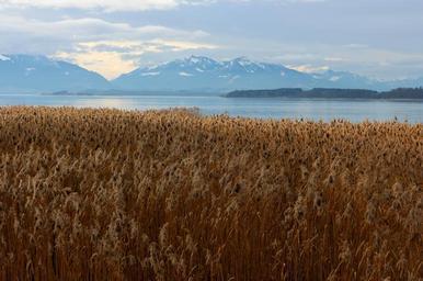 Keywords: eco system reed marsh plant live habitat birds animals nature bank water plant grass thicket nature conservation landscape chiemsee mountains lake panorama foresight distant vision view wide