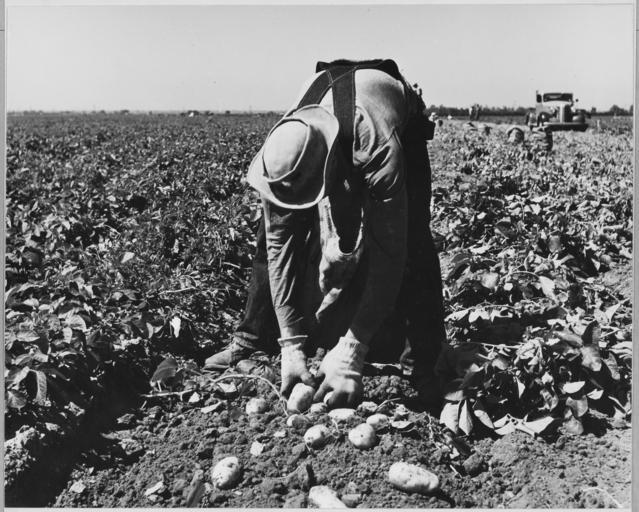 | Keywords: Edison, Kern County, California. 17-year-old boy agri. (sic) worker sacking early potatoes after mec . . . - NARA - 521813.jpg Scope and content Full caption reads as follows Edison Kern County California 17-year-old boy agri sic worker sacking early potatoes after mechanical potato digger on large-scale potato ranch Kern County planted 27 250 acres in potatoes 1940 General notes 521813 Local identifier 83-G-41569 Department of Agriculture Bureau of Agricultural Economics Division of Economic Information ca 1922 - ca 1953 NARA-Author Lange Dorothea 1895-1965 Photographer 1372774 <br /> Still Picture Records Section Special Media Archives Services Division NWCS-S National Archives at College Park 8601 Adelphi Road College Park MD 20740-6001 1940-04-11 Record group Record Group 83 Records of the Bureau of Agricultural Economics 1876 - 1959 Record group ARC 412 Photographic Prints Documenting Programs and Activities of the Bureau of Agricultural Economics and Predecessor Agencies compiled ca 1922 - ca 1947 documenting the period ca 1911 - ca 1947 Series ARC 521048 File unit File unit ARC Variant control numbers NAIL Control Number NWDNS-83-G-41569 Other versions <gallery> File Edison _Kern_County _California _17-year-old_boy_agri _ sic _worker_sacking_early_potatoes_after_mec_ _ _ _-_NARA_-_521813 tif tif File Edison _Kern_County _California _17-year-old_boy_agri _ sic _worker_sacking_early_potatoes_after_mec_ _ _ _-_NARA_-_521813 jpg jpg </gallery> NARA-cooperation PD-USGov Dorothea Lange Edison California Manual harvesting Potato harvest 1940 in California Fields in California |