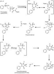 Keywords: Edman degradation (German).svg Detailed reaction mechanism of the Edman degradation; created with BKchem and Inkscape Own 2008-05-13 Kreuvf Other fields + Edman degradation Reaction mechanisms