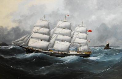 | Keywords: Édouard Adam - The Richard Rylands passing the Fastnet Rock (1881).jpg Édouard Adam 1847-1929 the painting of the Richard Rylands shows the wearing house flag of Vaughan Brother date 1881 oil canvas cm 85 130 2 accession number object history credit line exhibition history Ed Adam Havre 1881 ~ lower right signature / date The full-rigged three-masted merchantman žRichard Rylands was built by King in New Brunswick Canada in 1863 Registered at 1 390 tons she measured 203 feet in length with a 40 foot beam and was owned first by Seddons of Liverpool who put her into the Indian trade In the late 1860s Seddons sold her to Vaughan Brothers also of Liverpool who placed her under the command of Captain Sheckell Remaining in the Indian trade she disappears from record in 1877 after being sold to German owners http //www bonhams com/auctions/16837/lot/65/ Bonhams London 2009 09 15 lot 65 PD-old-auto-1923 1926 DEFAULTSORT Adam Edouard; Richard Rylands 1881 Édouard Adam 19th-century sailing ships in paintings Richard Rylands ship 1863 Paintings not categorised by year Images from Bonhams |