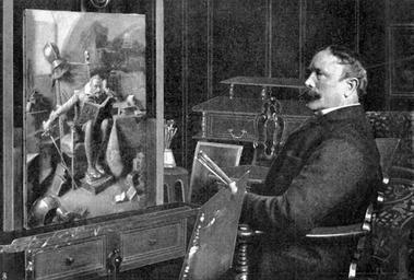 Keywords: Eduard Grützner.jpg de Eduard Grützner vor seinem Gemälde Don Quixote Die Gartenlaube Illustriertes Familienblatt Jahrgang 1904 2 Beilage zu Nr 13 S 3 author 1904 pd-old Eduard von Grützner Don Quixote in art Gartenlaube 1904