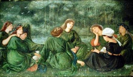 | Keywords: Edward Burne-Jones Green Summer (1864).jpg Green Summer watercolour or gouache on paper 1864 The models include w Jane Morris center holding a peacock feather and Georgiana Burne-Jones second from right reading a book A version in oils was completed in 1868 1864 Technique oil canvas in Private collection object history credit line accession number http //www art-prints-on-demand com/kunst/sir_edward_burne_jones/green_summer_hi jpg <gallery> File Edward Burne-Jones Green Summer 1868 jpg Oils 1868 </gallery> PD-old-100 Paintings by Edward Burne-Jones Jane Morris Georgiana Burne-Jones |