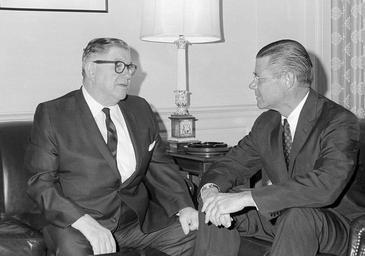| Keywords: Edward J. Patten meeting with Robert McNamara, August 1965.JPEG Congressman Edward J Patten D-New Jersey left meets with Secretary of Defense Robert S McNamara in his Pentagon http //www dodmedia osd mil/DVIC_View/Still_Details cfm SDAN DASN8511303 JPGPath /Assets/Still/1985/Army/DA-SN-85-11303 JPG 1965-08-18 PHC HAROLD WISE PD-USGov-Military-Navy Members of the United States House of Representatives from New Jersey Patten Edward J Robert McNamara McNamara Robert August 1965 in the United States |