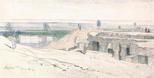 | Keywords: Edward Lear - Abydos, 1-00 pm, 12 January 1867 (134) - Google Art Project.jpg inscribed in black ink lower left Abydus 1 PM January 12 1867 ; in black ink lower right 134 ; Verso in graphite upper left 30 up next above Lowest Not on View Watercolor with pen in gray and black ink over graphite on thick slightly textured cream wove paper architectural subject sky palm trees stone columns architectural elements temples ruins structures single built works figures landscape special url_id QwGeCbQRcJJjng PD-old-100-1923 1888 Egypt by Edward Lear Google Art Project works by Edward Lear Abydos 1867 |