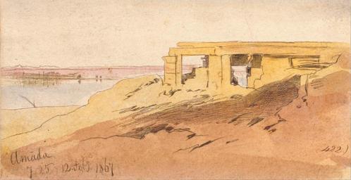 | Keywords: Edward Lear - Amada, 7-25 am, 12 February 1867 (422) - Google Art Project.jpg inscribed in brown ink lower left Amada 7 25 12 Feby 1867 ; in brown ink lower right 422 ; Verso in graphite center 244 Not on View Watercolor with pen in brown ink over graphite on moderately thick slightly textured cream wove paper mounted on thick moderately textured cream wove paper architectural subject sky sand water temple ruins river landscape desert special url_id mQEGRS_AGw0mCQ PD-old-100-1923 1888 Egypt by Edward Lear Temple of Amada Amada Google Art Project works by Edward Lear |