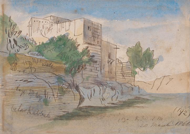 | Keywords: Edward Lear - Below Rabat, Malta - Google Art Project.jpg inscribed in brown ink lower let below Rabbat ; inscribed in brown ink lower right 192 8 30AM 20 March 1866 Not on View Watercolor with pen in brown ink over graphite on medium slightly textured cream wove paper mounted on moderately thick slightly textured brown wove paper sky bushes rocks trees structure single built work genre subject special url_id UQEC0pi9sJaQOg PD-old-100-1923 1888 Google Art Project works by Edward Lear Malta by Edward Lear 1866 in Malta Rabat Malta |
