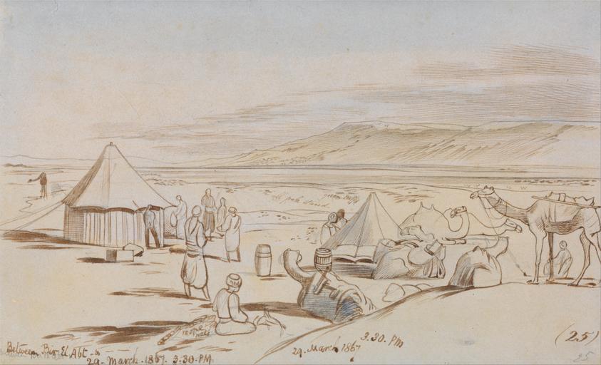 | Keywords: Edward Lear - Between Bir El Abt - Google Art Project.jpg inscribed in brown ink lower left Between Bin E Abt- 29-March 1867 3 30 PM ; in brown ink lower center 29 March 1867 3 30 PM ; in brown ink lower right 25 ; Verso in graphite upper left 173 up Middle ; in graphite upper right 365 Not on View Watercolor with pen in brown ink over graphite on moderately thick slightly textured blue wove paper sky camels mammals sand tents figures representations landscape camp sites temporary settlements special url_id wwEphOan5HuF8A PD-old-100-1923 1888 Paintings by Edward Lear Google Art Project works by Edward Lear |