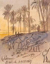 | Keywords: Edward Lear - Colósaneh, 5-45 - 6-00 p.m., January 3, 1867 (62) - Google Art Project.jpg inscribed in brown ink lower left Colossaneh 5 45-6 Jany 3 1867 ; in brown ink lower right 62 ; Verso in graphite upper left 12 up Top ; in graphite upper right 76 Not on View Watercolor witih pen in brown ink over graphite on moderately thick rough cream wove paper sky camels mammals palm trees figures representations genre subject special url_id WQG2JLsO6ng0YQ PD-old-100-1923 1888 Egypt by Edward Lear Google Art Project works by Edward Lear |