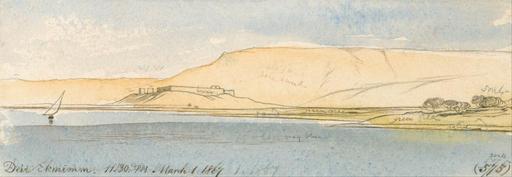 | Keywords: Edward Lear - Deir Ekhmim - Google Art Project.jpg inscribed in brown ink lower left Deir Ekmimm 11 30 PM March 1 1867 ; in brown ink lower right 575 Not on View Watercolor with pen in brown ink over graphite on thick rough cream wove paper sky water river riverbank hills trees buildings sail landscape marine art boat special url_id cwHdrM0hpcXrkg PD-old-100-1923 1888 Egypt by Edward Lear Google Art Project works by Edward Lear Nile in art Akhmim | ||||