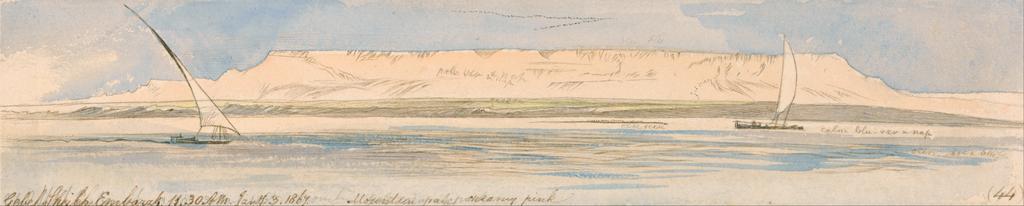 | Keywords: Edward Lear - Gebel Sheikh Embarak - Google Art Project (2426047).jpg inscribed in brown ink lower left Gebel Sheikh Embarah 11 30AM Jany 3 1867 ; inscribed in brown ink lower center Mountain pale creamy pink ; inscribed in brown ink lower right 44 ; Verso in graphite upper left 8 up next below Not on View Watercolor with pen in brown ink over graphite on moderately thick slightly textured beige wove paper sky water river sails landscape marine art boats special url_id 1AGqbn2GdqDgkw PD-old-100-1923 1888 Egypt by Edward Lear Nile in art Google Art Project works by Edward Lear |