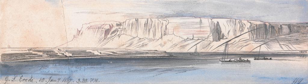 | Keywords: Edward Lear - Gebel Sheikh Eredi - Google Art Project (2294527).jpg inscribed in gray-black ink lower left G S Eredi 10 Jany 1867 3 20 PM ; in blue ink lower right; 119 ; Verso in graphite upper left 28 up Middle in graphite upper right 116 Not on View Watercolor with pen in black and cochineal ink over graphite on moderately thick slightly textured cream wove paper sky water cliffs river landscape boats special url_id NQFL5cL0vvJc4g PD-old-100-1923 1888 Egypt by Edward Lear Nile in art Google Art Project works by Edward Lear |