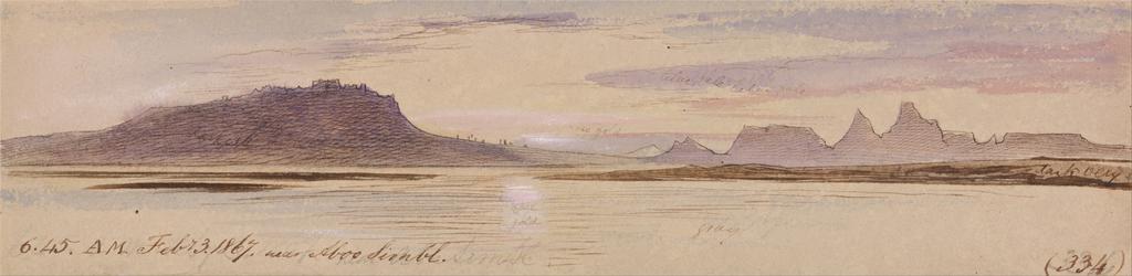 | Keywords: Edward Lear - Near Abu Simbel - Google Art Project.jpg inscribed in brown ink lower left 6 45 AM Febr 3 1867 near Aboo Simbl ; in brown ink lower right 334 ; Verson in graphite upper right 208 Not on View Watercolor with pen in brown ink and gouache over graphite on moderately thick moderately textured cream wove paper mounted on thick moderately textured cream wove paper sky sunrise water river hills landscape special url_id kAEDXP1YQK9MRA PD-old-100-1923 1888 Egypt by Edward Lear Nile in art Google Art Project works by Edward Lear |