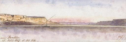 | Keywords: Edward Lear - Near Dendour - Google Art Project (2286894).jpg inscribed in brown ink lower left near Dendoor 15 Feby 1867 5 50 PM ; in brown ink lower right 487 ; Verso in graphite upper left 264 ; in graphite center Dendoor 8 45Am Feby 16 1878 ; in graphite center right 493 Not on View Watercolor with pen in brown ink over graphite on medium slightly textured wove paper mounted on moderately thick slightly textured cream wove paper sky water cliffs landscape marine art boat special url_id kQHSlh0Yqj8Z1g PD-old-100-1923 1888 Egypt by Edward Lear Google Art Project works by Edward Lear |