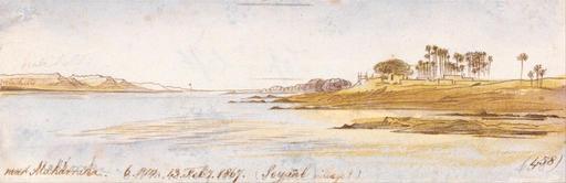 | Keywords: Edward Lear - Near Maharraka, 6-00 p.m., February 13, 1867 (458) - Google Art Project.jpg inscribed in brown ink lower left near Maharraka 6 PM 13 Feby 1867 Seyaal village ; in brown ink lower right 458 ; on mount in graphite lower right 252 ; Verso in graphite upper left 252 Not on View Watercolor with pen in brown ink over graphite on medium slightly textured wove paper mounted on moderately thick slightly textured cream wove paper sky palm trees water lake river riverbank hills building landscape special url_id BQERY95reNy1aA PD-old-100-1923 1888 Egypt by Edward Lear Google Art Project works by Edward Lear Maharraqa |