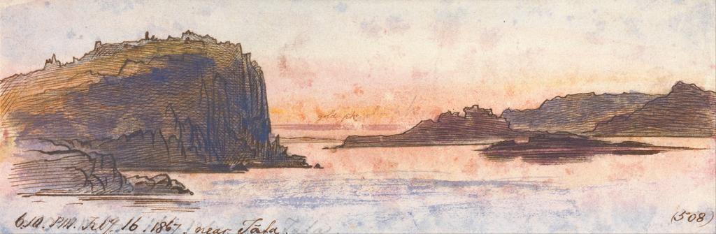 | Keywords: Edward Lear - Near Tafa, 6-10 pm, 16 February 1867 (508) - Google Art Project.jpg inscribed in brown ink lower left 6 10 PM Feby 16 1867 near Tafa ; in brown ink lower right 508 ; Verso in graphite center 273 Not on View Watercolor with pen in brown ink over graphite on medium slightly texutred wove paper mounted on thick slightly textured cream wove paper sky rocks water cliffs river landscape special url_id yQGMvaY00ZnoRA PD-old-100-1923 1888 Egypt by Edward Lear Google Art Project works by Edward Lear |